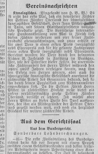 Bericht über die Ausstellungsresultate von Jean Pfister als Züchter von Glatthaarpinschern an der Hundeausstellung in Zürich im Jahre 1933. Wie beschrieben ist das Gründungsmitglied Jean Pfister damals aus der Sektion ZO ausgetreten da für ihn die Zucht (Ausstellungen) gegenüber der Hundeausbildung im Verein zu kurz kamen.
