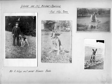 Links: Bilder des Vereingründers und ersten Präsidenten der SKG Sektion Zürcher Oberland Rudolf Kägi und seiner damaligen Schäferhundin Boda von Reckenholz S.H.S.B. 10353