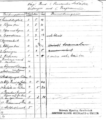 Das Notenblatt von Rudolf Kägi dem ersten Präsidenten der SKG Zürcher Oberland anlässlich einer Prüfung in den zwanziger Jahren. Wie man sieht wurden auch damals die Punkte nicht geschenkt. Beim Aportieren wurde hier "mehr Schneid" verlangt.