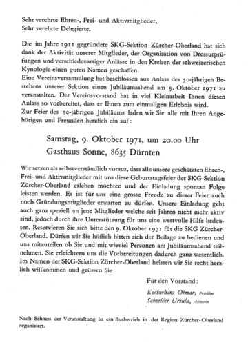 Einladung an die 50 Jahrfeier der SKG Sektion Zürcher Oberland.